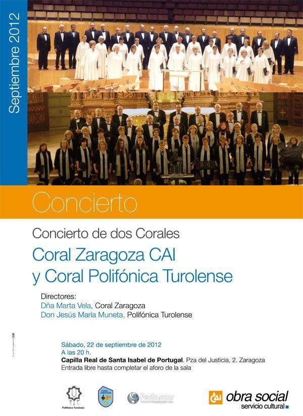 El concierto «Concierto 2 Corales» reunirá a la Coral Zaragoza CAI y a la Polifónica Turolense en una interpretación de 3 partes el próximos sábado 22 de Septiembre de 2012.