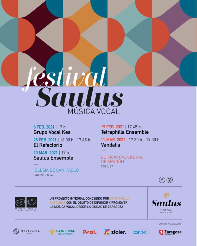 Zaragoza, 4 de febrero de 2021. Con el fin de difundir y promover la música vocal desde Zaragoza, este sábado arranca el Festival Vocal Saulus, el primer evento de este género en la capital aragonesa. Del 6 de febrero al 20 de marzo, distribuidos en la iglesia de San Pablo y el edifico modernista de la Caja Rural de Aragón, cinco conciertos reunirán a algunos de los grupos vocales más reconocidos del panorama nacional, por primera vez todos ellos en Zaragoza. El encargado de la inauguración será el grupo vasco Kea Ahots Taldea, a las 17 horas en la iglesia San Pablo, al que seguirán los próximos días Vandalia, Josep Vila i Casañas, Tetraphilla Ensemble y Saulus Ensemble, el primer coro de cámara profesional de Aragón.