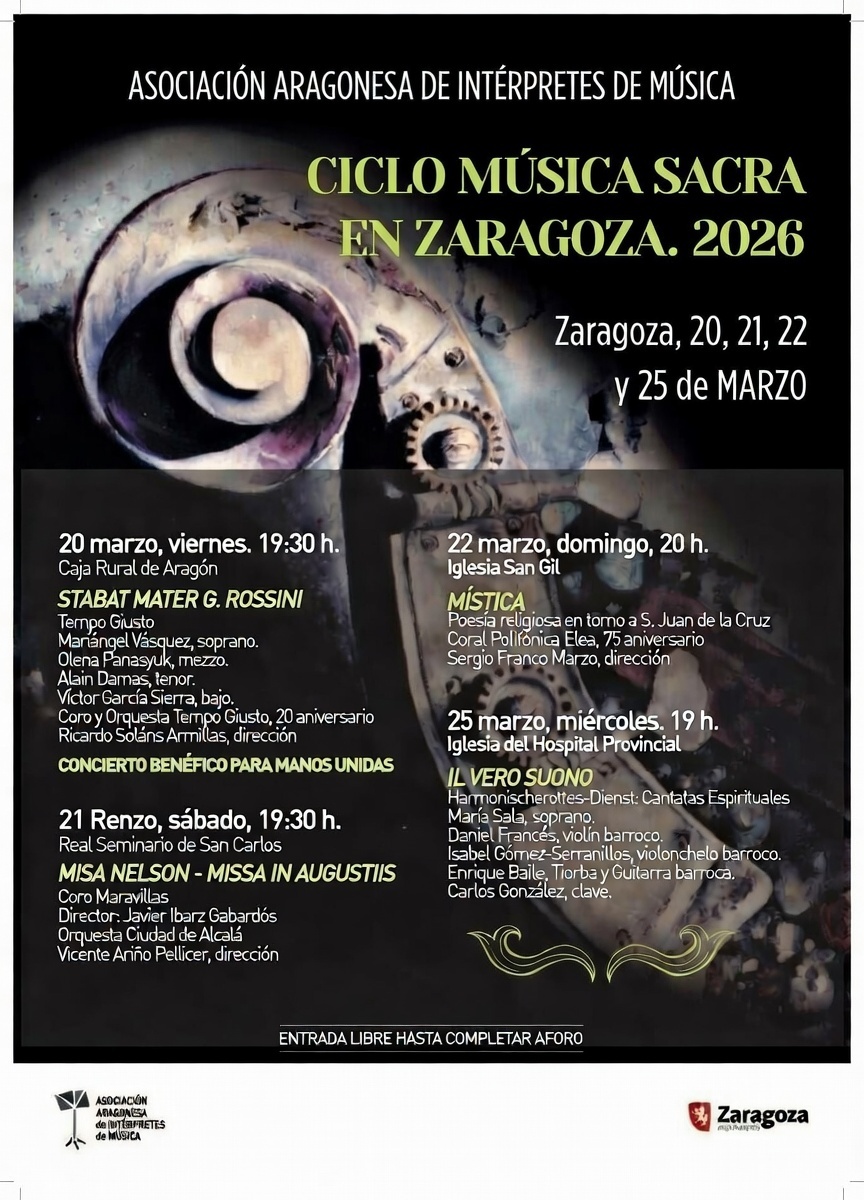 En los días previos al comienzo de la Semana Santa Zaragoza, los amantes de la música clásica se podrán reencontrar con el Ciclo de Música Sacra de Zaragoza, que vuelve del 20 al 25 de marzo a diferentes emplazamientos de la ciudad. Los templos de San Gil, del Hospital Provincial, el Real Seminario de San Carlos y el Salón de Actos de la Caja Rural de Aragón serán los elegidos en esta edición para acoger las obras de compositores como Rossini, Haydn y Telemann, además de hacer un repaso por la Poesía religiosa en torno a S. Juan de la Cruz.
